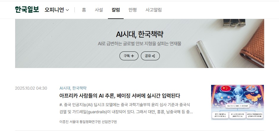 2025. 10. 2. “African People’s AI Inference is Real-Time Input to Beijing Servers.” Op-Ed, Hankook Ilbo.